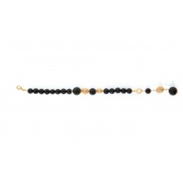 Bracciale con un filo di pietre naturali ( agata nera sfaccettata ) e inserti in ottone.Gli inserti sono delle piccole sfere lucide e delle scagliette, con la possibilità di sceglierle sia colore oro che argento.Questo abbinamento tra il tondo delle sfere e della pietra e la spigolosità delle scaglie attribuiscono al gioiello una armoniosa vivacita'.Per...