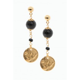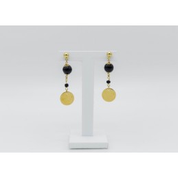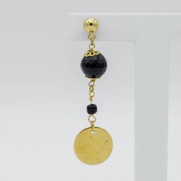 Orecchino pendente semilungo, facile da abbinare visto la sua semplice eleganza. La lucentezza della pietra e del disco in ottone rendono il gioiello ancor più brillante
