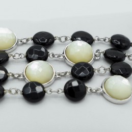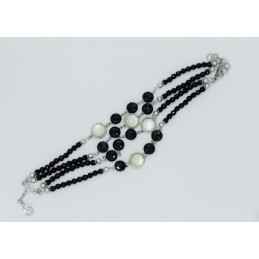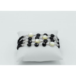 Elegante bracciale multifili, composto da piccole pietre di agata nera sfaccettata e castoni in argento 925 i quali contengono una madreperla naturale sfaccettata donando luminosità al gioiello.