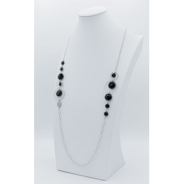 La collana si presenta con la parte superiore infilata in un cavetto d'acciaio, su un lato troverete un grappolodi pietre naturali, nello specifico agata nera sfaccettata. Le pietre della parte inferiore del gioiello sono interamenteannodate singolarmente e a mano, questo dona preziosità e originalità al prodotto