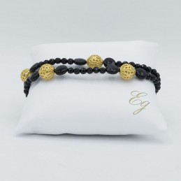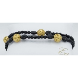 Elegante e raffinato questo gioiello si presenta con piccole agate infilate su un cavetto in acciaio. Assieme alle pietre naturali troviamo abbinate delle sfere traforate dorate le quali danno un tocco di grazia in più.