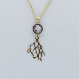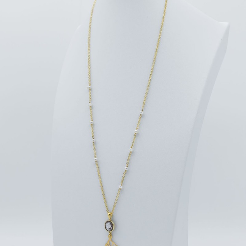 Elegante pendente con cammeo rifinito a mano e rametto in argento 925 lucido specchiato, le perle sono annodate singolarmente una per una, questo aumenta il pregio di questo gioiello.