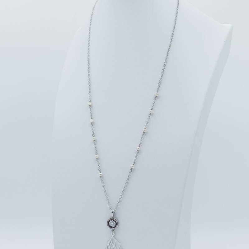 Elegante pendente con cammeo rifinito a mano e rametto in argento 925 lucido specchiato, le perle sono annodate singolarmente una per una, questo aumenta il pregio di questo gioiello.