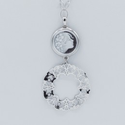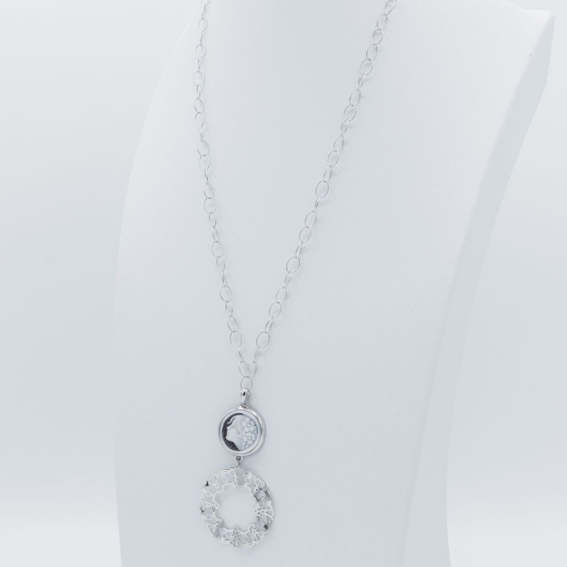Elegante ciondolo con cammeo viso rifinito a mano, il pendente in argento 925 assieme alla catena ovale rendono questo gioiello unico originale, proprio come te.