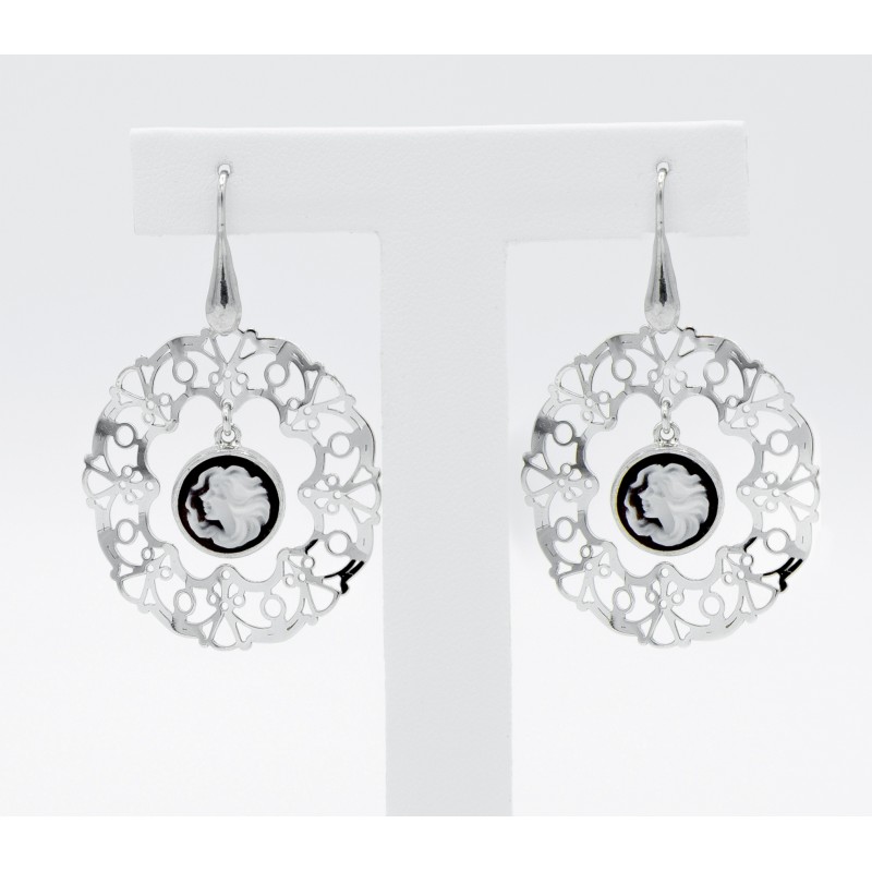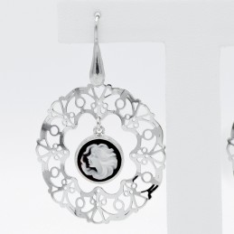 Sempre elegante il cammeo naturale, in questo orecchino lo ritroviamo al centro del pendente in argento 925. Il tutto si fonde in un armonioso e raffinato gioiello.