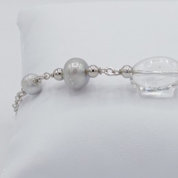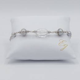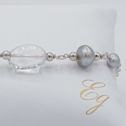 Splendida collana luminosa e raffinata con i cristalli di rocca abbinati sapientemente alla perle grigia, il tutto arricchito con cerchi in argento 925.