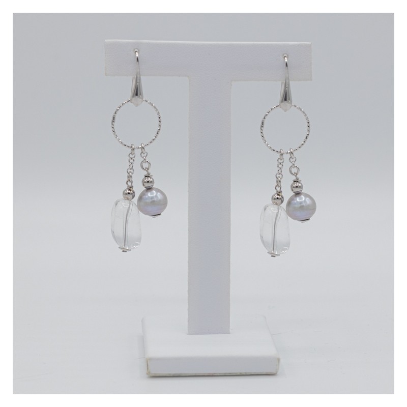 Splendida collana luminosa e raffinata con i cristalli di rocca abbinati sapientemente alla perle grigia, il tutto arricchito con cerchi in argento 925.