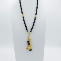 La collana si presenta con la parte superiore infilata in un cavetto d'acciaio, su un lato troverete un grappolodi pietre naturali, nello specifico agata nera sfaccettata. Le pietre della parte inferiore del gioiello sono interamenteannodate singolarmente e a mano, questo dona preziosità e originalità al prodotto