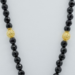 Bracciale composto da una parte da agata nera e dall'altra da sfere traforate. Questa netta divisione regala al gioiello una maggiore visibilità, adatto a una donna che non ama passare inosservata.Le sfere traforate sono disponibili sia nel versione colore oro che nella versione colore argento