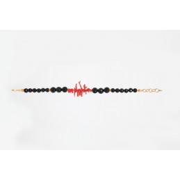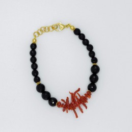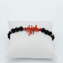 Bracciale con corallo naturale e pietre dure. Questo aggraziato gioiello esalta la semplicità dell'eleganza, grazie all'accoppiata rosso corallo con la sfaccettatura nera dell'agata naturale.