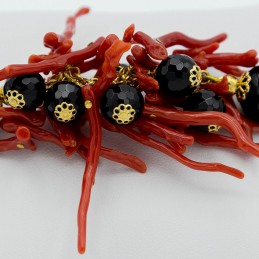 Gioiello in corallo e agata nera sfaccettata. La parte centrale del bracciale è composta da tre dischi di pietre dure annodate tra di loro, tra una pietra e l'altra troviamo dei grappoli di corallo accompagnati da alcune agate. Mentre la parte esterna del bracciale è formata dal corallo cilindro infilato. Stiloso ed originale.