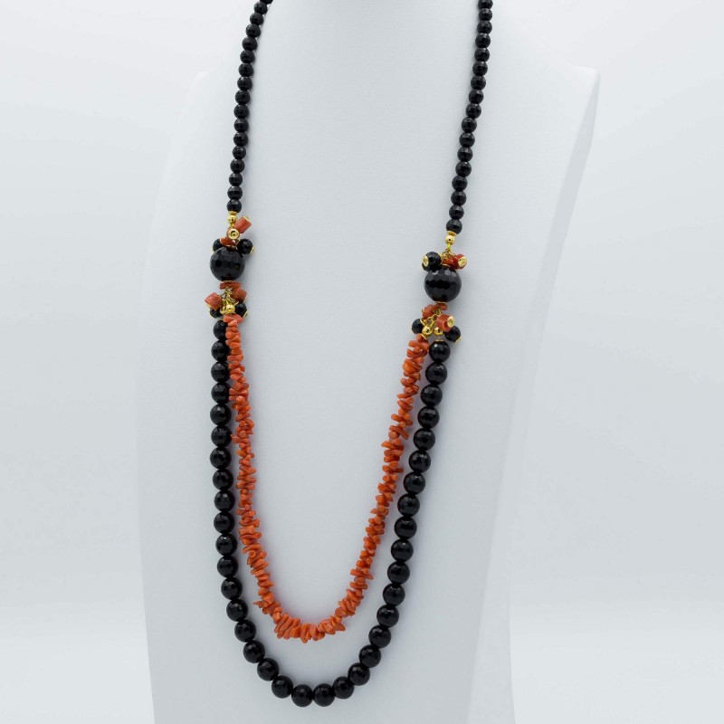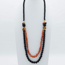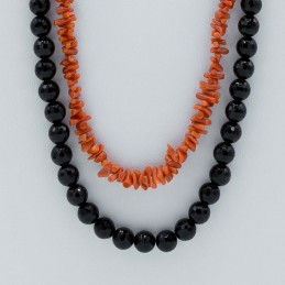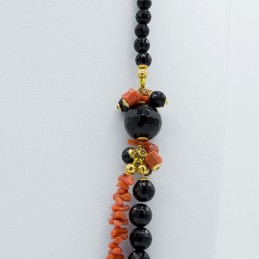 Collana con pendente formato da pietre dure e corallo. In questo articolo troviamo due forme di agata nera sfaccettata, rotonda e piatta. Il modello è interamente assemblato a mano con le pietre annodate singolarmente, nella parte sopra al pendente si nota un particolare formato da due fili di corallo cilindro infilato. Unica ed originale ideale per te...