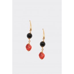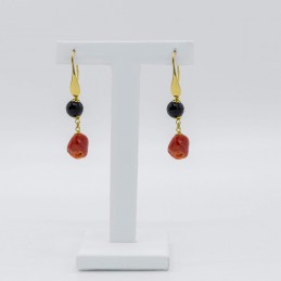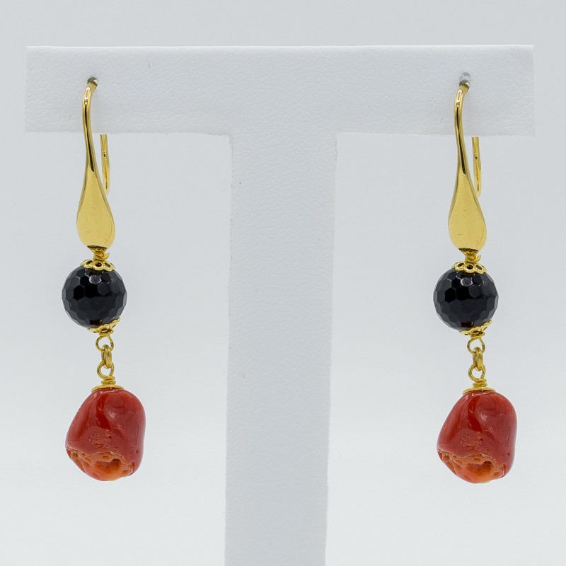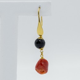 Orecchino semilungo con agata nera sfaccettata e corallo sassolino.