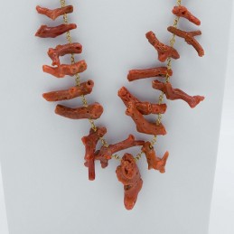 Prezioso girocollo con corallo naturale. In questo gioiello viene risaltata quello che è l'essenza della natura, difatti la collana è composta da pezzi di corallo di forma quasi cilindrica semi allungata. Ogni singolo pezzo di corallo viene precedentemente lavorato a mano così da renderlo lucido e quasi vellutato al tatto. Elegante e stilosa.