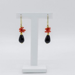 Elegante orecchino pendente con due fili di pietre dure e corallo, arricchito da una perla bianca lucida la quale assieme alle sfaccettature dell'agata donano luce al gioiello.
