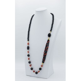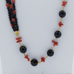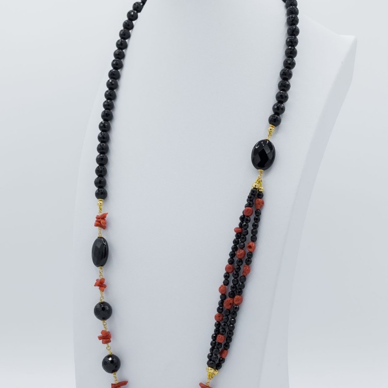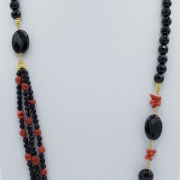 collana lunga con agata nera sfaccettata e corallo naturale cupolino. Modello formato da tre parti, due con spinello nero (pietra naturale) e corallo cupolino infilato a mano in un cavetto d'acciaio rivestito e l'altra composta da pietre naturali di due dimensioni annodate una ad una e collegate tra di loro con piccole contromaglie, così da ottenere un...