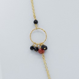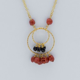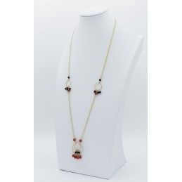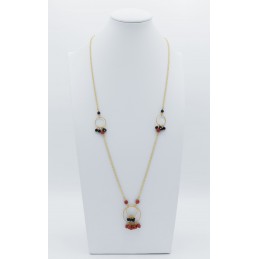 Collana lunga con inserti a cerchio in argento dorato e pietre naturali, elegantemente abbinati tra loro. I grappoli laterali di corallo arricchiscono il gioiello stesso rendendolo ancor più originale.