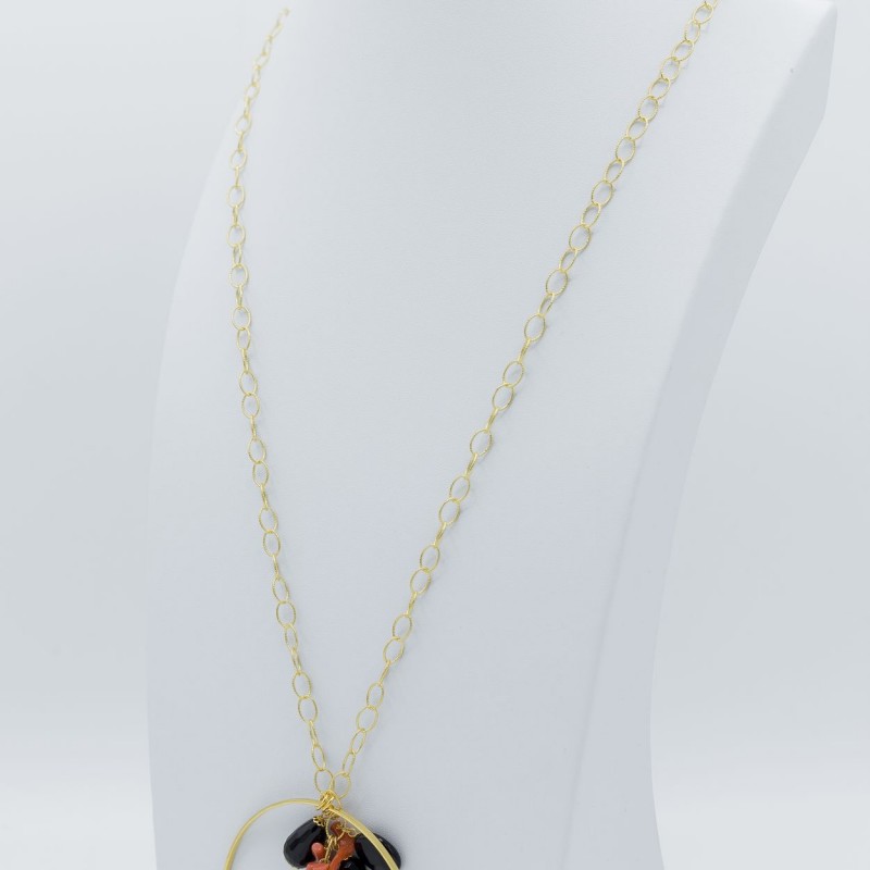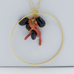 Pendente giovanile e originale. Il grande cerchio in argento 925 che contiene un grappolo di pietre naturali e corallo è il suo punto di forza. Indossalo su una t-shirt ed un paio di jeans così da valorizzare al massimo il tuo look.