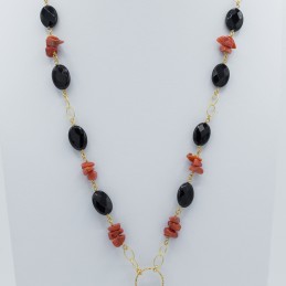 Pendente giovanile e originale. Il grande cerchio in argento 925 che contiene un grappolo di pietre naturali e corallo è il suo punto di forza. Indossalo su una t-shirt ed un paio di jeans così da valorizzare al massimo il tuo look.
