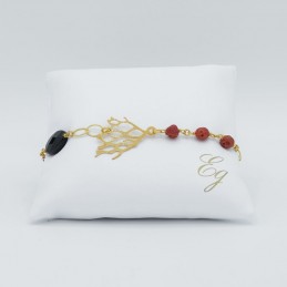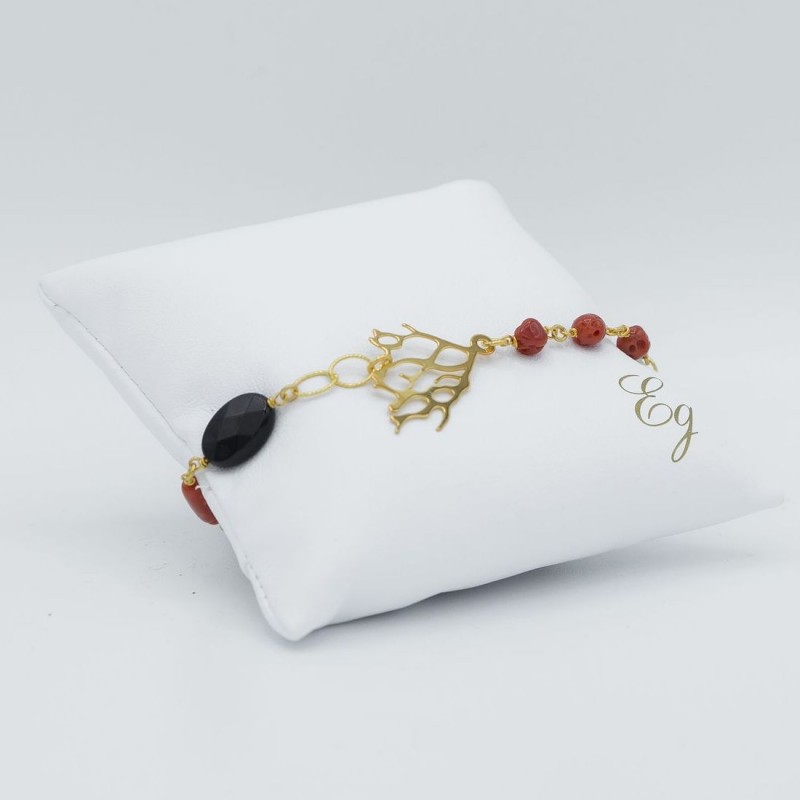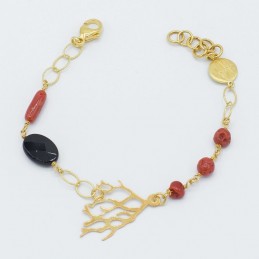 Bracciale con corallo naturale e pietre dure. Questo aggraziato gioiello esalta la semplicità dell'eleganza, grazie all'accoppiata rosso corallo con la sfaccettatura nera dell'agata naturale.