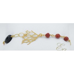 Gioiello in corallo e agata nera sfaccettata. La parte centrale del bracciale è composta da tre dischi di pietre dure annodate tra di loro, tra una pietra e l'altra troviamo dei grappoli di corallo accompagnati da alcune agate. Mentre la parte esterna del bracciale è formata dal corallo cilindro infilato. Stiloso ed originale.