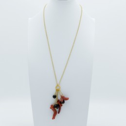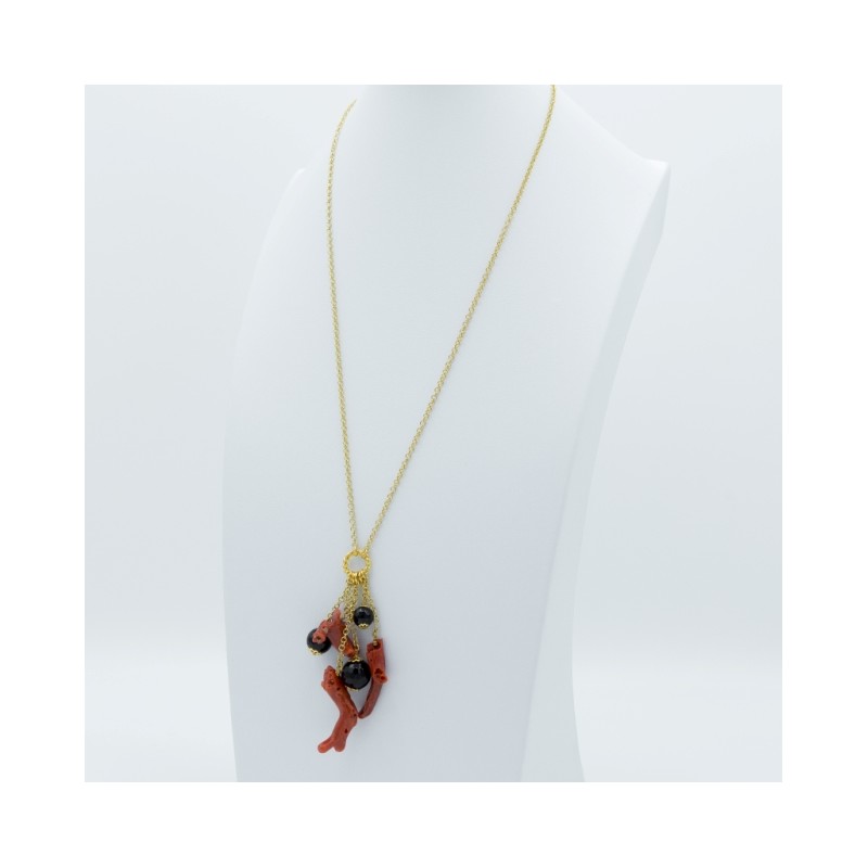 Fantastica collana lunga con catena in argento di colore nero. In questo gioiello abbiamo voluto valorizzare il corallo, infatti l'abbinamento tra la catena nera con il rosso naturale del corallo mette in risalto quest'ultimo. Un monile unico e prezioso.