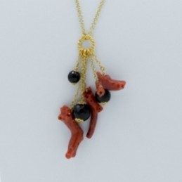 collana lunga con agata nera sfaccettata e corallo naturale cupolino. Modello formato da tre parti, due con spinello nero (pietra naturale) e corallo cupolino infilato a mano in un cavetto d'acciaio rivestito e l'altra composta da pietre naturali di due dimensioni annodate una ad una e collegate tra di loro con piccole contromaglie, così da ottenere un...