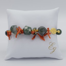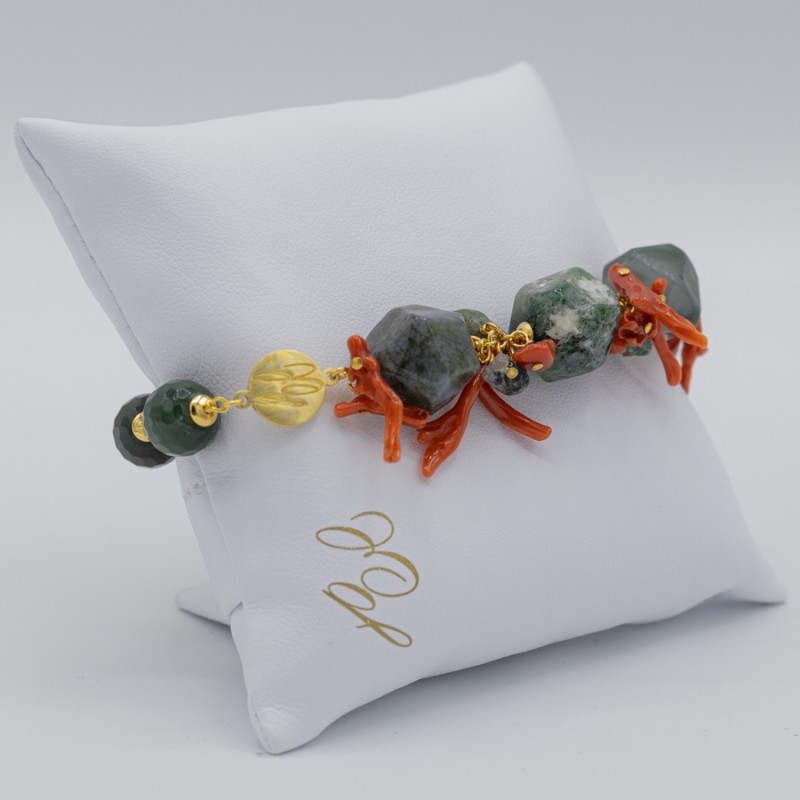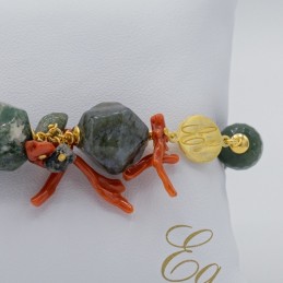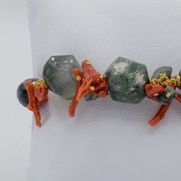 Maestosa collana con il verde dell'agata muschiata che predomina sul rosso naturale del corallo. Elementi naturali che si fondono in un miscuglio di forme e colori creando un gioiello dal forte impatto.