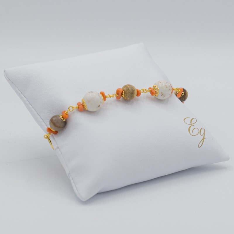 Collana lunga con inserti a cerchio in argento dorato e pietre naturali, elegantemente abbinati tra loro. I grappoli laterali di corallo arricchiscono il gioiello stesso rendendolo ancor più originale.