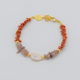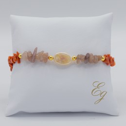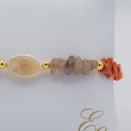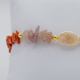 Particolare collana con catena in argento dorato nella parte superiore e scaglie di agata strawberry e corallo nella parte inferiore, questo mix di forme crea un gioiello molto originale.