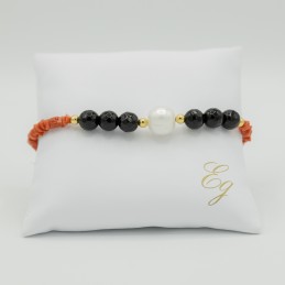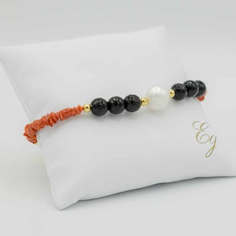 Semplice bracciale composto da scaglie di corallo naturale dal colore rosso intenso, che abbinate al nero dell'agata riesce ad esprimere il massimo della sua eleganza. Il tutto arricchito da una perla semitonda naturale.