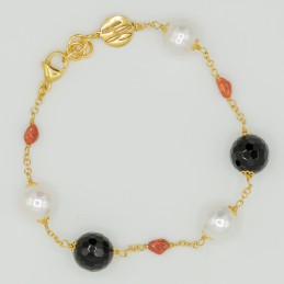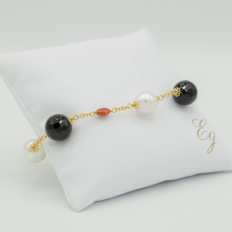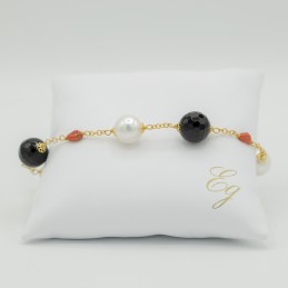 Classica chanel composta da agate tonde grandi con perle lucide e brillanti. Il sassolino di corallo dona al gioiello quel tocco in più di colore. Elegante collana senza tempo.