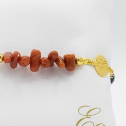 Elegante bracciale con corallo naturale abbinato al quarzo blu sfaccettato. La lavorazione che presenta questo gioiello è mista, perché troviamo una parte dello stesso con pietre e coralli annodati singolarmente e un altra con corallo infilato in un cavo di acciaio.