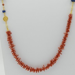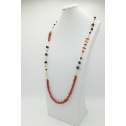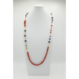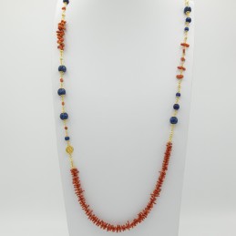 Splendida collana lunga con abbinamenti perfetti. Il rosso del corallo naturale risalta ancor di più le brillanti sfaccettature del quarzo blu. Un gioiello che non ti può mancare.