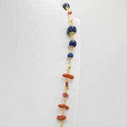 Elegante bracciale con corallo naturale abbinato al quarzo blu sfaccettato. La lavorazione che presenta questo gioiello è mista, perché troviamo una parte dello stesso con pietre e coralli annodati singolarmente e un altra con corallo infilato in un cavo di acciaio.