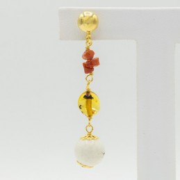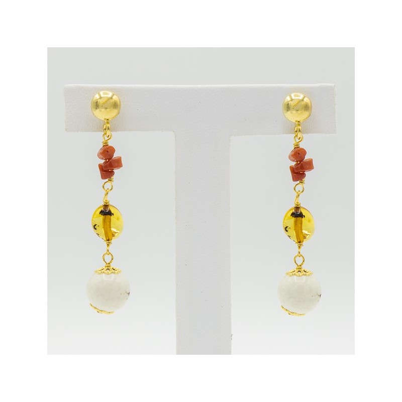 Elegante orecchino pendente con due fili di pietre dure e corallo, arricchito da una perla bianca lucida la quale assieme alle sfaccettature dell'agata donano luce al gioiello.