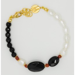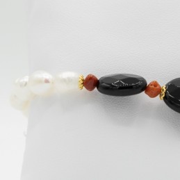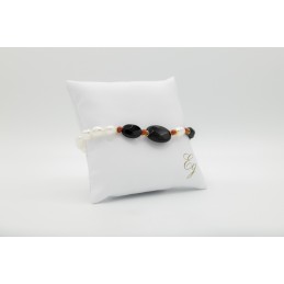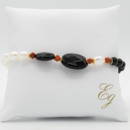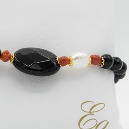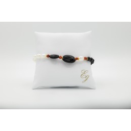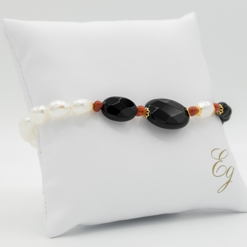 Bracciale con agata nera sfaccettata e perle, impreziosite da coralli naturali. Gioiello classico senza tempo.