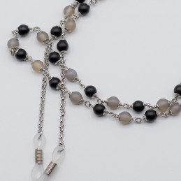 Cordino per occhiali con quarzo grigio satinato e agata nera liscia satinata. Tenui e delicati i toni di queste pietre arricchiscono il tuo look con la semplicità.