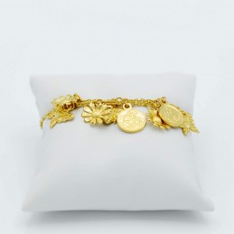 Bracciale in ottone con vari charms. L'unione di pendenti di forme e dimensioni diverse rende questo gioiello unico ed originale.