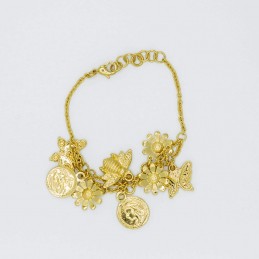 Splendida e originale. Questa collana è arricchita da tanti elementi con forme diverse. Nei charms troviamo delle monete, api e farfalle. Disponibile anche colore argento.