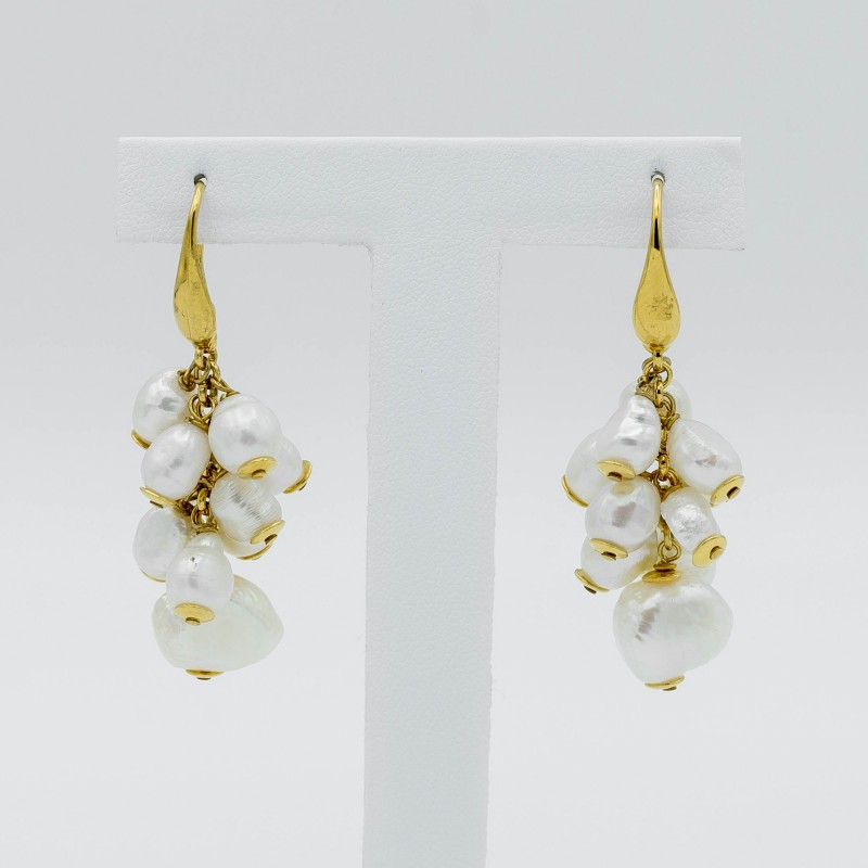 Fantastico gioiello con perle annodate manualmente. Le perle di dimensioni diverse danno una sinuosa ed elegante forma a questo orecchino. Disponibile sia colore oro che colore argento.