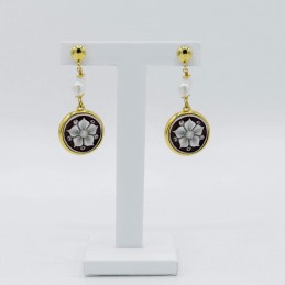 Orecchino pendente con perle naturali e sfere traforate grandi in ottone galvanizzato/rodiato.Composto da elementi annodati tra loro, dona un effetto luminoso al tuo viso grazie alla brillantezza delle perle associate alle sfere.Disponibile più lungo se richesto con la monachella (amo) al posto del perno.
