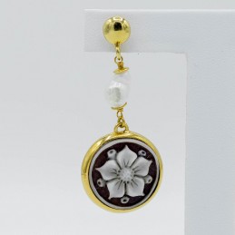 Particolare orecchino con corallo a forma di sassolini, i quali vengono sapientemente, abbinati al chiarore della perla e alle eleganti sfumature dell'agata strawberry.