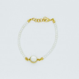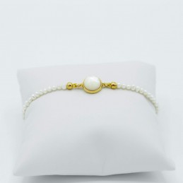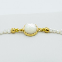 Raffinato e luminoso bracciale. Il suo particolare lo troviamo nella parte centrale, formata da sfere e perle piccole che sono accanto al castone centrale che contiene la madreperla.
