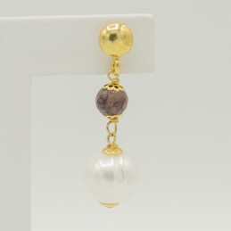 Elegante collana, semplice nella sua struttura ma allo stesso tempo raffinata e preziosa. In questo gioiello troviamo una serie di dimensioni e misure diverse di perle, egregiamente abbinate alla Mokalite una splendida pietra dai colori caldi e unici.