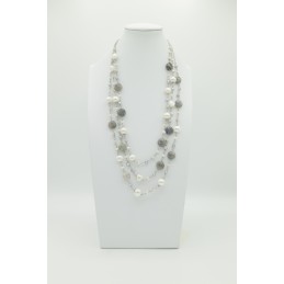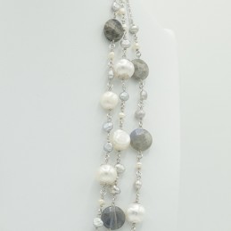 Favolosa collana a due fili composta da perle naturali associate a pietre sfaccettate. La pietra di questo gioiello è la Labradorite, che grazie alle sue gradazioni e sfumature di colori rende questa collana eccentrica e originale.