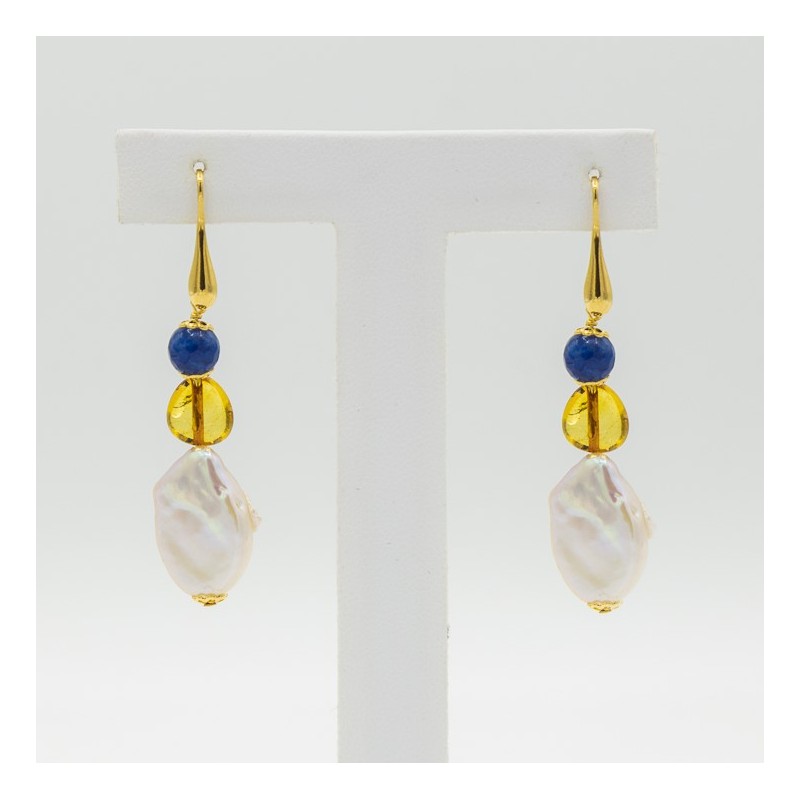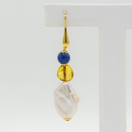Estroso bracciale con quarzo citrino irregolare nella parte centrale. L'ambra regala sia colore che preziosità al gioiello. Il tutto è arricchito da piccole sfere di ematite oro intervallate tra il quarzo blu e il quarzo citrino.