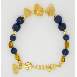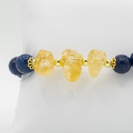 Estroso bracciale con quarzo citrino irregolare nella parte centrale. L'ambra regala sia colore che preziosità al gioiello. Il tutto è arricchito da piccole sfere di ematite oro intervallate tra il quarzo blu e il quarzo citrino.