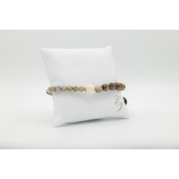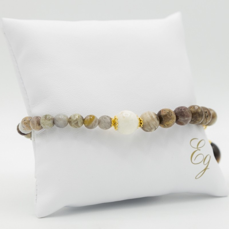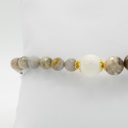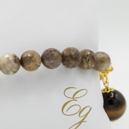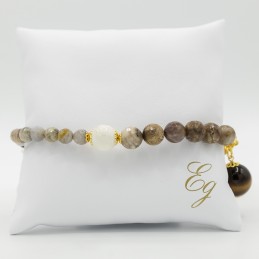 Bracciale infilato con diaspro naturale sfaccettato e agata flowers grigia. Il particolare del bracciale è l'aulite centrale e l'occhio di tigre che funge da pendente.