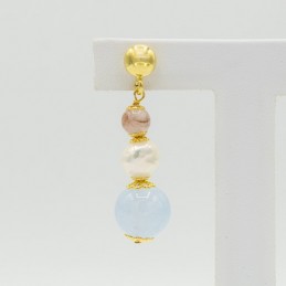 Orecchino colorato con giada celeste e acquamarina. Tra le due pietre naturali troviamo una luminosa perla. Semplice ed elegante, facile da abbinare.